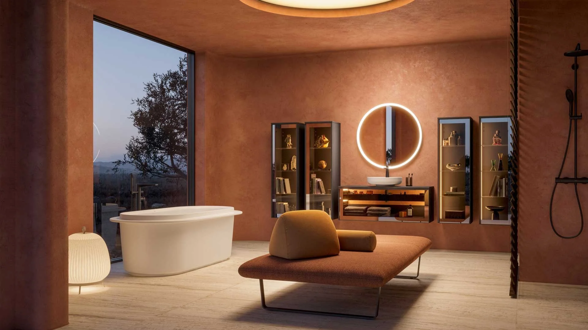 Used for colour drenching, warm tones create a grounded, spa-like feel that works particularly well in biophilic and wellness-inspired bathrooms. They also soften architectural spaces, making them feel more lived-in and personal.