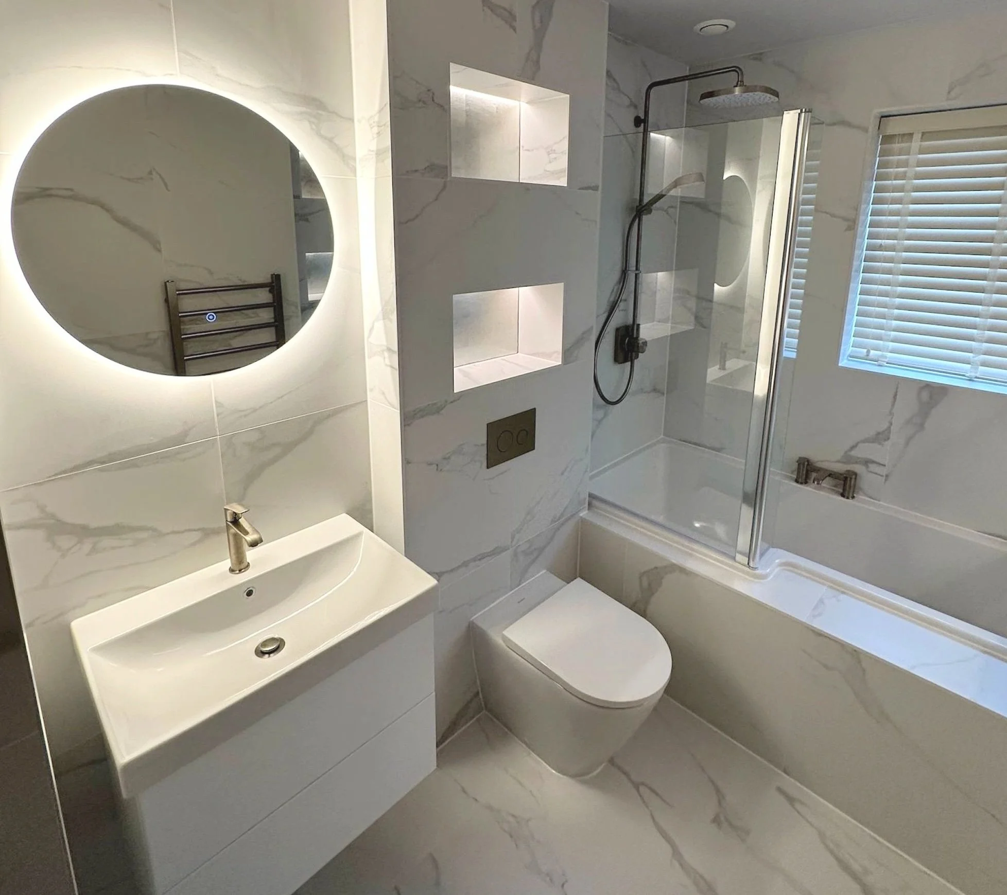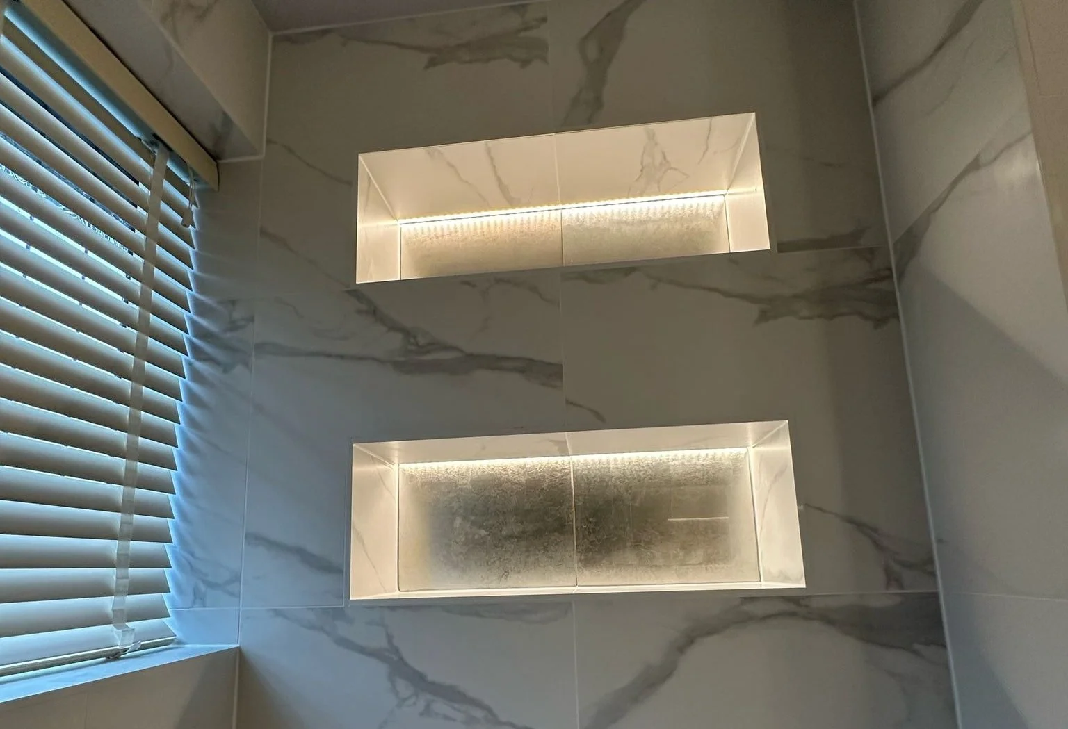 Even the smallest bathrooms can make a big impression with the right focal point. Whether it’s a bold patterned floor tile, a bespoke vanity unit, or subtle feature lighting in a recessed niche, these touches add personality without overcrowding the space.
